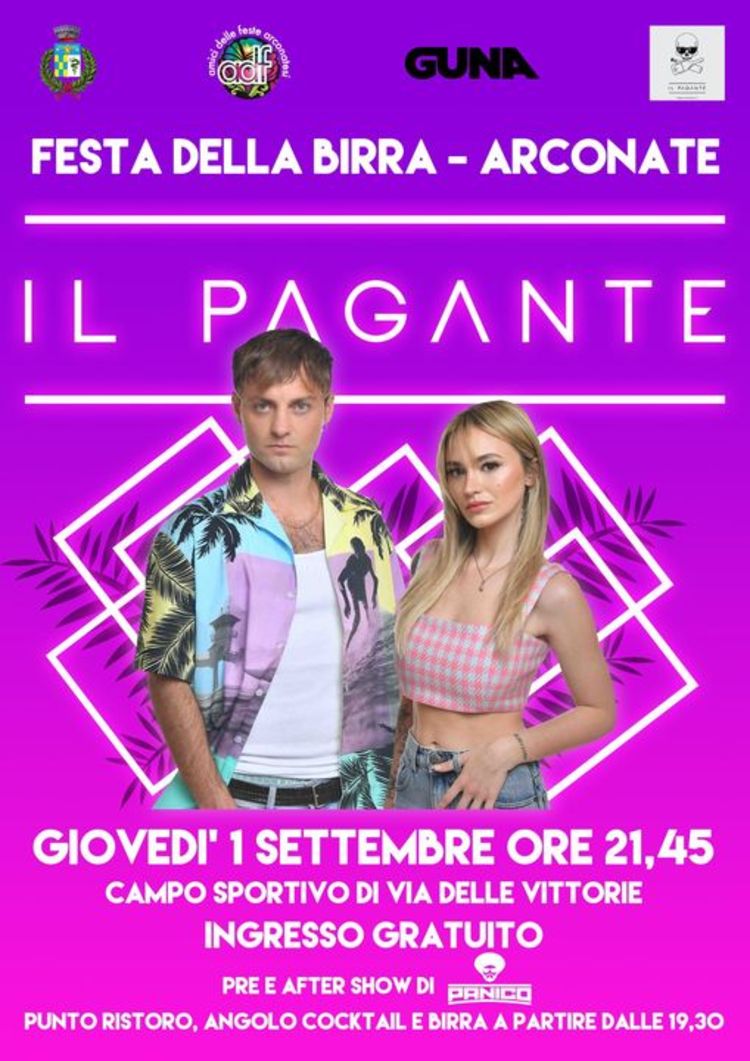 “Dopo il grande successo della festa patronale, un altro big arriva ad Arconate – annuncia l’assessore delegato agli Eventi, Francesco Colombo - Con ‘Il Pagante’ a ingresso gratuito al campo sportivo apriremo col botto una delle più divertenti ed esaltanti Feste della Birra di sempre. Sarà una serata bellissima, che ancora una volta proietta il nostro paese come uno dei centri più vivi e frizzanti dell’Altomilanese. Ma la manifestazione non si limita al concerto del Pagante: venerdì 2, sabato 3 e domenica 4 settembre ci si sposta nella tensostruttura coperta del campo sportivo per le altre tre serate di festa della birra. A breve annunceremo gli altri artisti”.