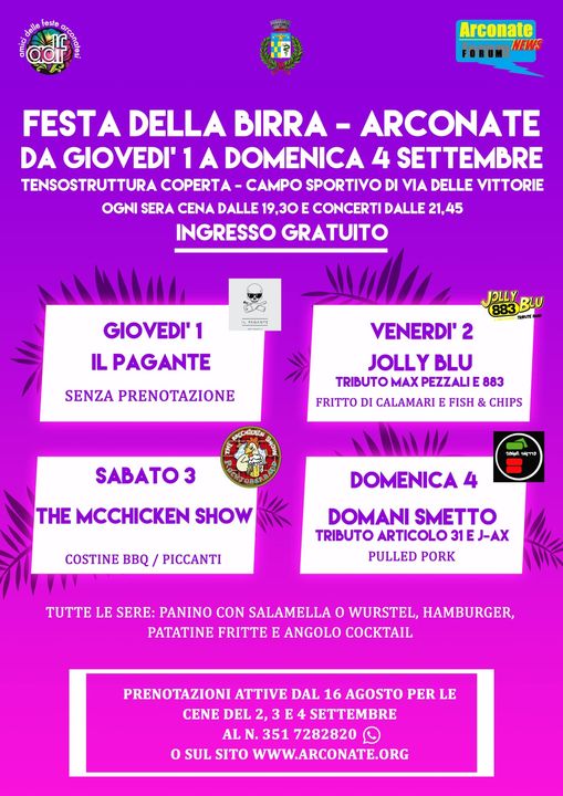 Venerdì 2, sabato 3 e domenica 4 settembre la Festa della Birra tornerà alla sua consueta configurazione. Per ciascuna di queste 3 serate è possibile prenotare il proprio tavolo: sono previsti menù speciali e concerti di tribute band all’interno della tensostruttura del campo sportivo, esattamente come gli anni scorsi.