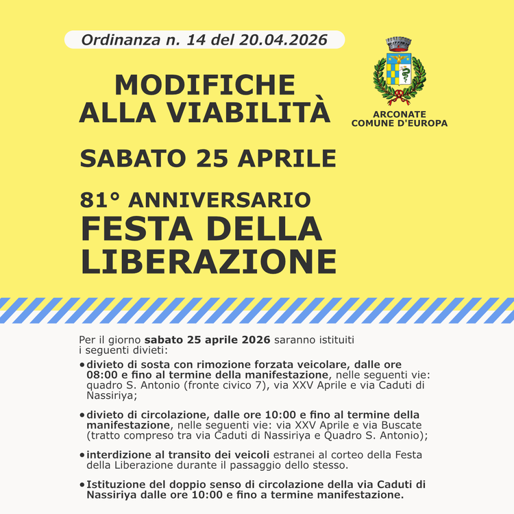 Per il giorno sabato 25 aprile 2026 saranno istituiti i seguenti divieti: